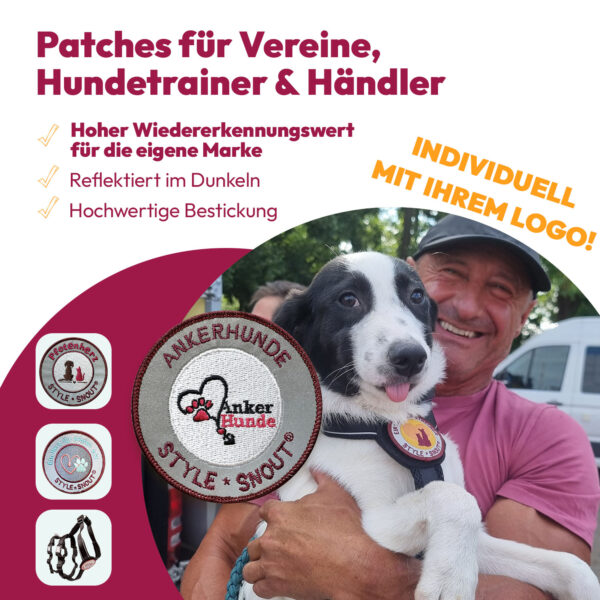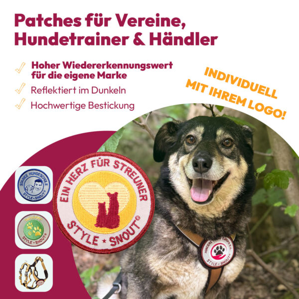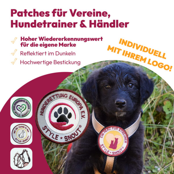Die Designs der aufwendig gestickten StyleSnout®-Sticker und die Anbringung im Brustbereich des Hundes sind eine absolute Neuheit auf dem Markt für Hundebedarf. Die reflektierende Basis des Stickers ist hochwertig mit witzigen Sprüchen oder Motiven bestickt, die je nach Tagesform oder für bestimmte Anlässe angebracht und ausgetauscht werden können. Die Patch sind neben der Sicherheit des Hundes auch für Schnappschüsse oder schöne Fotos des Lieblings gedacht und machen viel Spaß beim Anschauen.